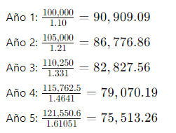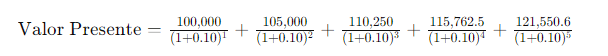 Imaginemos una empresa que proyecta generar flujos de caja anuales de $100,000 durante los próximos 5 años, y se espera que crezcan a una tasa del 5% anual. La tasa de descuento aplicable es del 10%.
