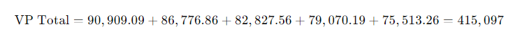 Por lo tanto, el valor presente de los flujos de caja futuros, y por ende el valor de la empresa según el Enfoque de Ingresos, es $415,097.